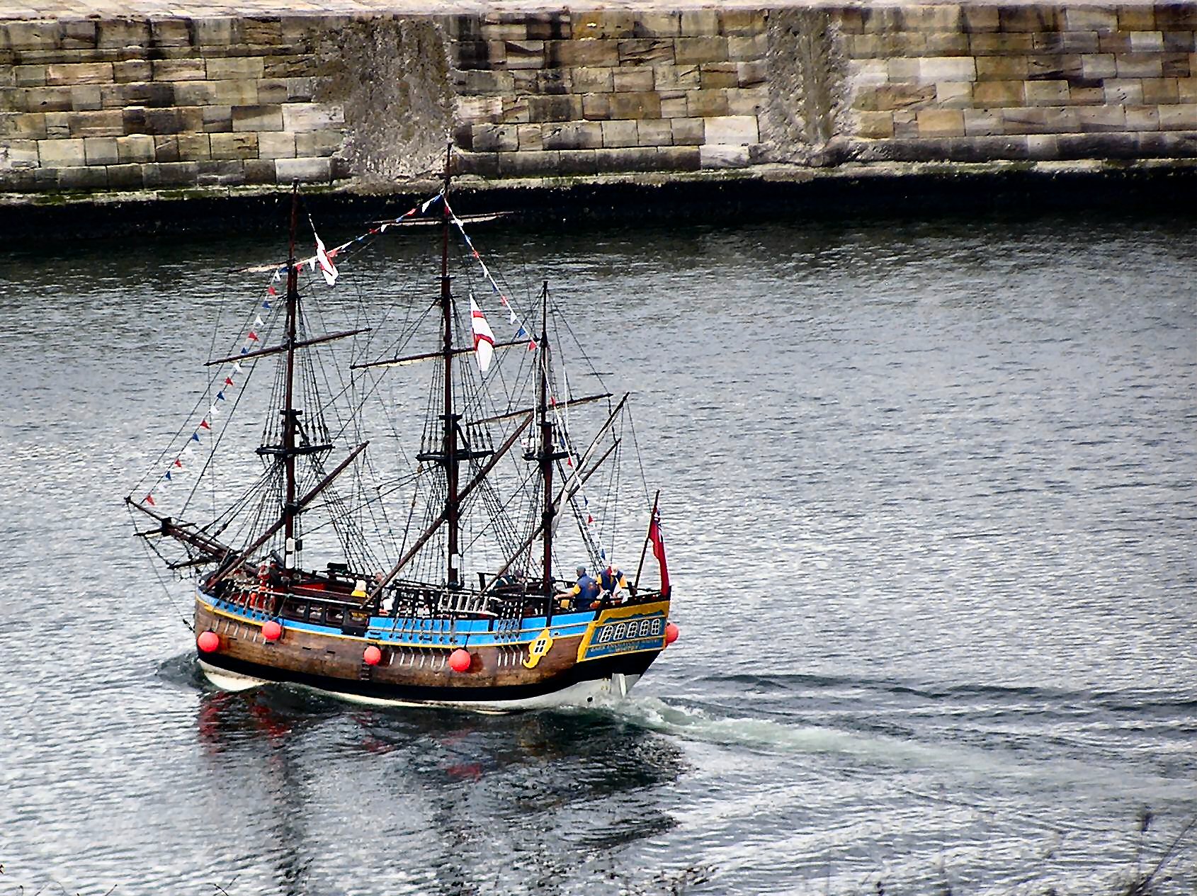 The authentic replica of HMS Endeavour, which was sailed by Captain James Cook during his scientific expeditions of 1748 has be traditionally built by Whitby craftsmen and stands in the water some 40% of the original ships size.